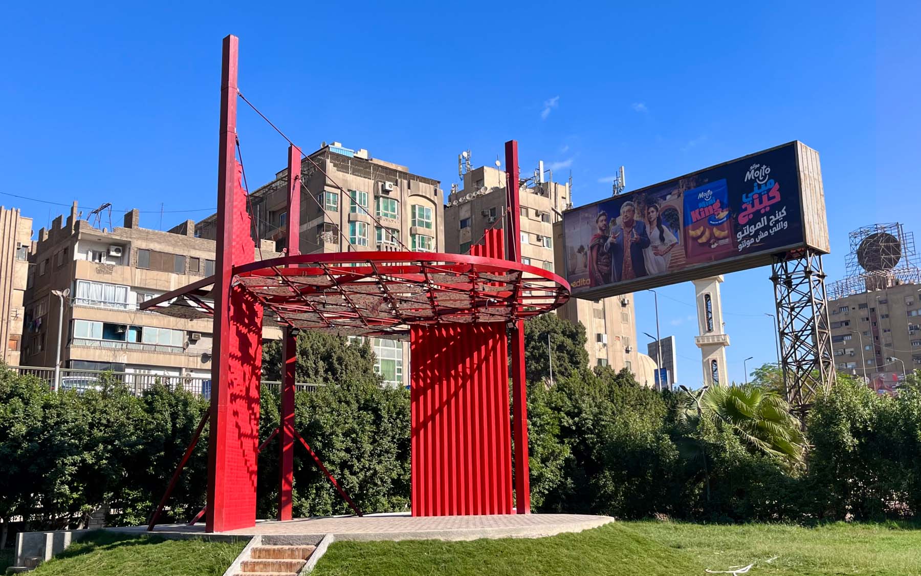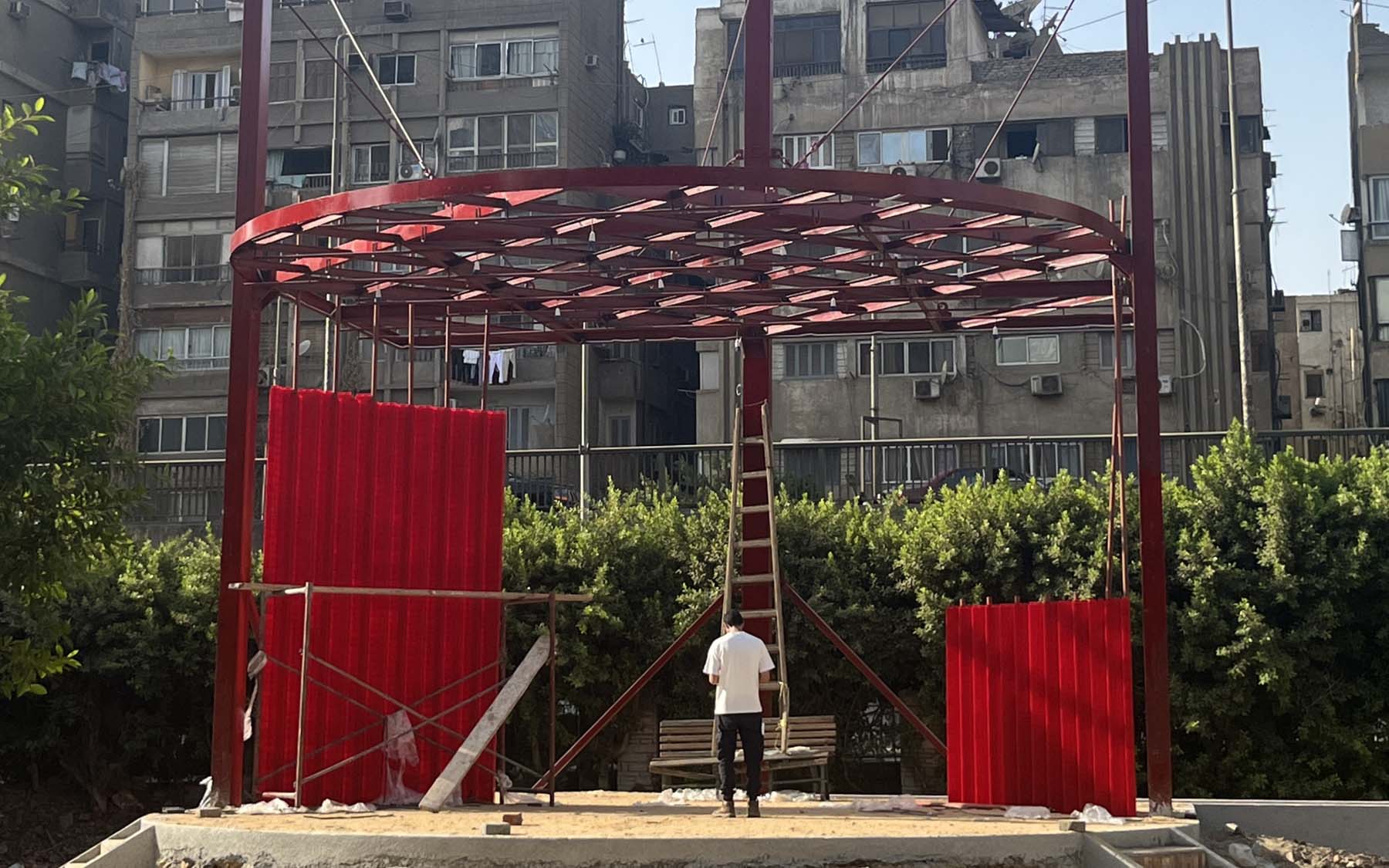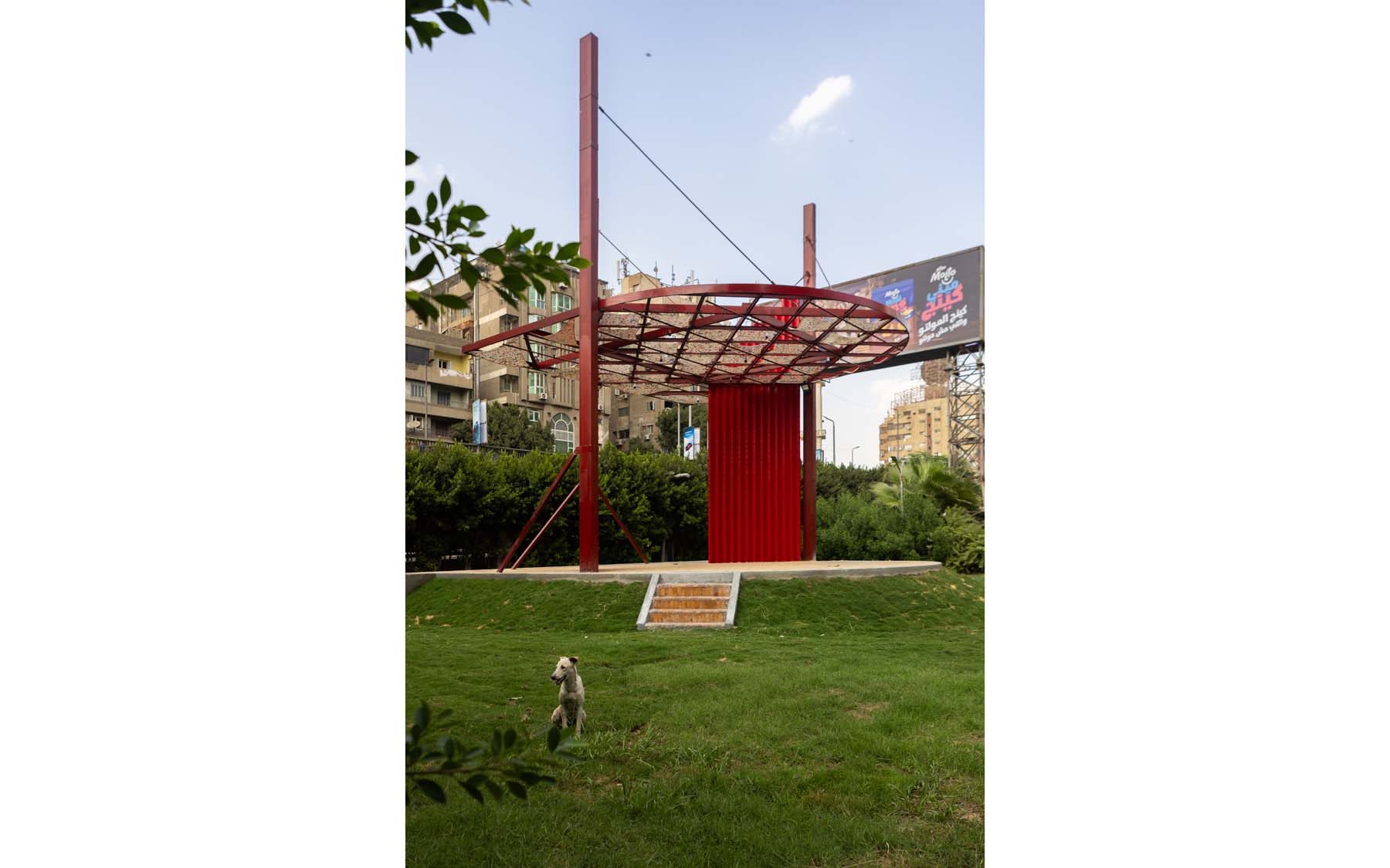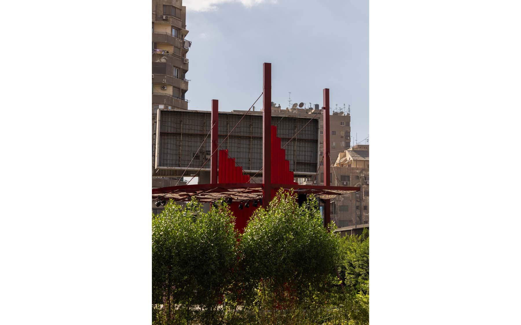 Pergola is a project designed and implemented by CLUSTER, in partnership with THISS Studio (London) and Orient Productions, with the support of Art Jameel and the British Council as part of “Anhar”: Culture and Climate Platform, under the auspices of Giza Governorate. The ten-meter-high red structure offers a dedicated space for performance and community use, introducing a bold cultural landmark to be viewed from the adjacent 6 October bridge amidst an urban landscape dominated by advertising billboards.