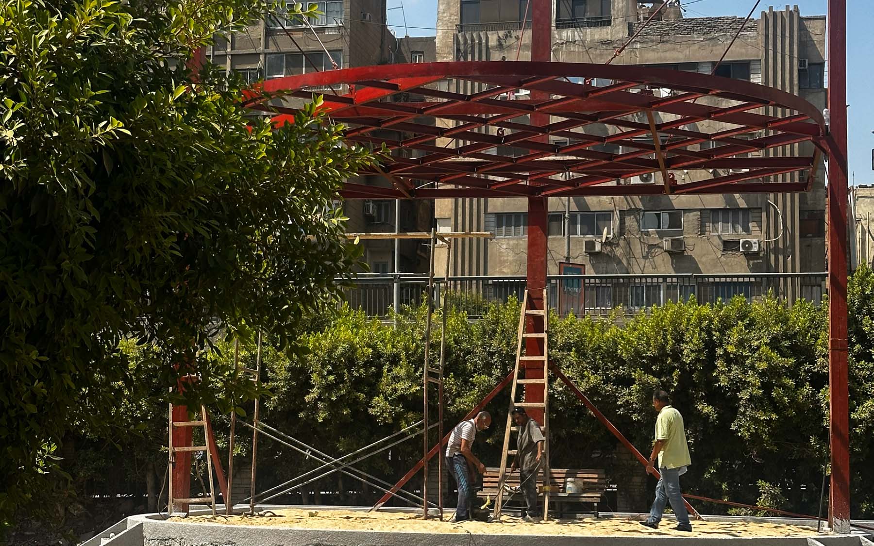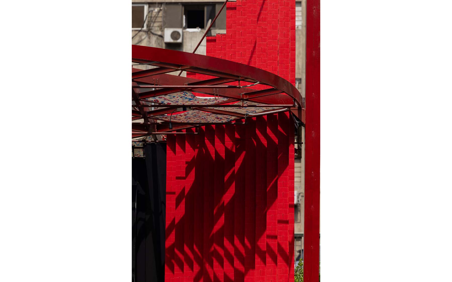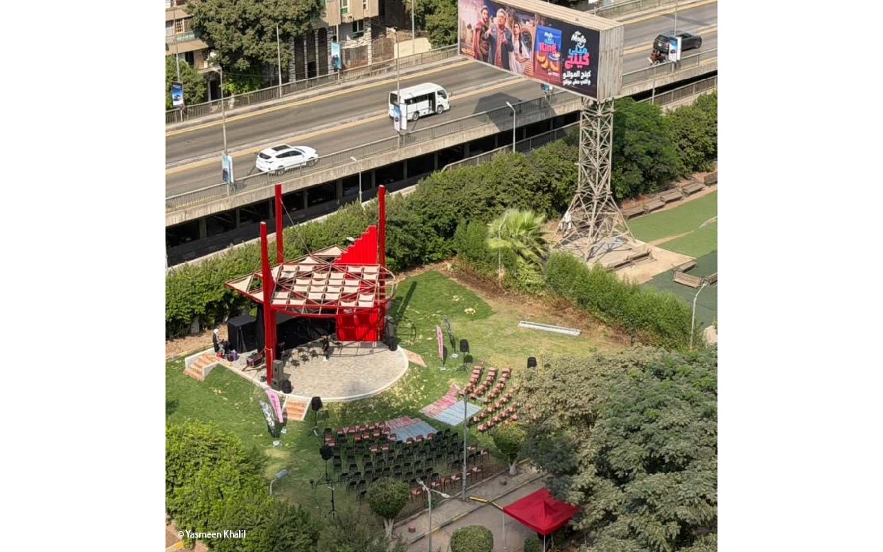 Pergola is a project designed and implemented by CLUSTER, in partnership with THISS Studio (London) and Orient Productions, with the support of Art Jameel and the British Council as part of “Anhar”: Culture and Climate Platform, under the auspices of Giza Governorate. The ten-meter-high red structure offers a dedicated space for performance and community use, introducing a bold cultural landmark to be viewed from the adjacent 6 October bridge amidst an urban landscape dominated by advertising billboards.