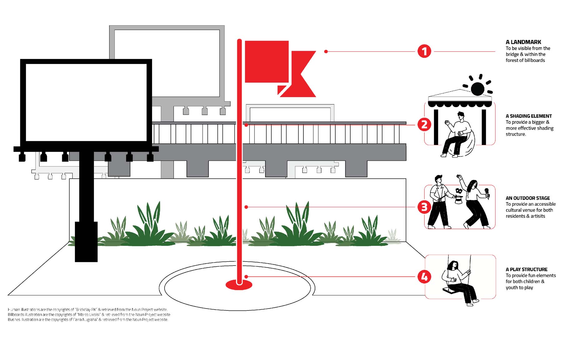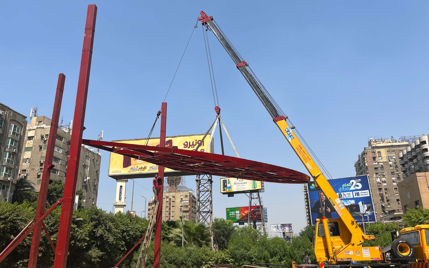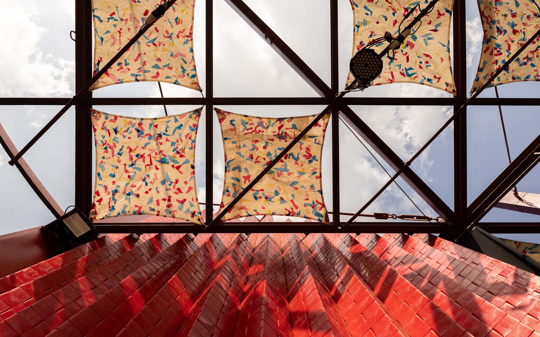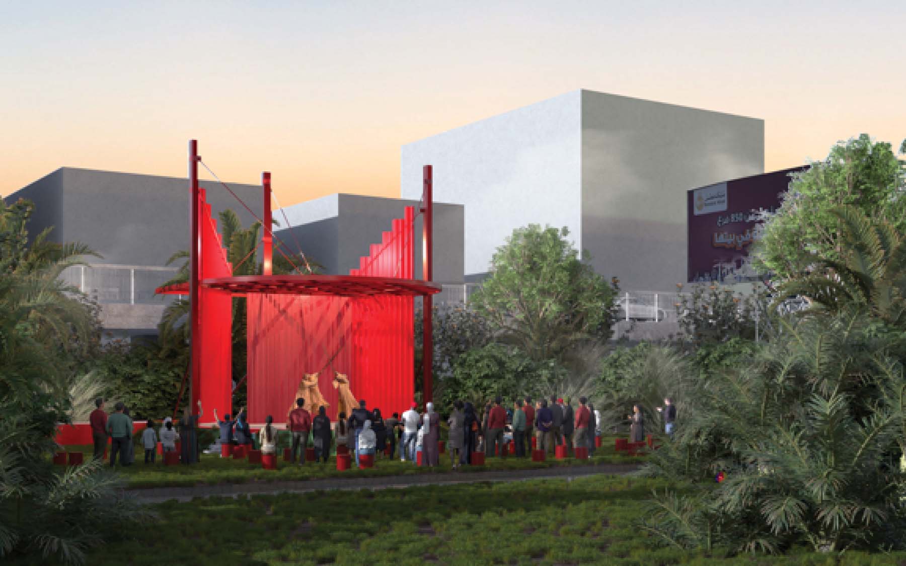 Pergola is a project designed and implemented by CLUSTER, in partnership with THISS Studio (London) and Orient Productions, with the support of Art Jameel and the British Council as part of “Anhar”: Culture and Climate Platform, under the auspices of Giza Governorate. The ten-meter-high red structure offers a dedicated space for performance and community use, introducing a bold cultural landmark to be viewed from the adjacent 6 October bridge amidst an urban landscape dominated by advertising billboards.